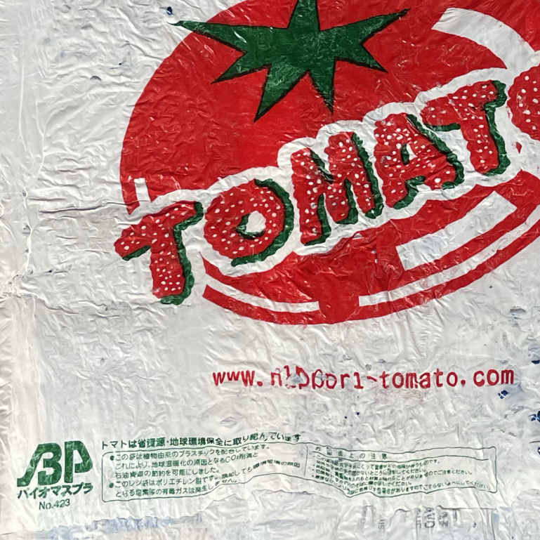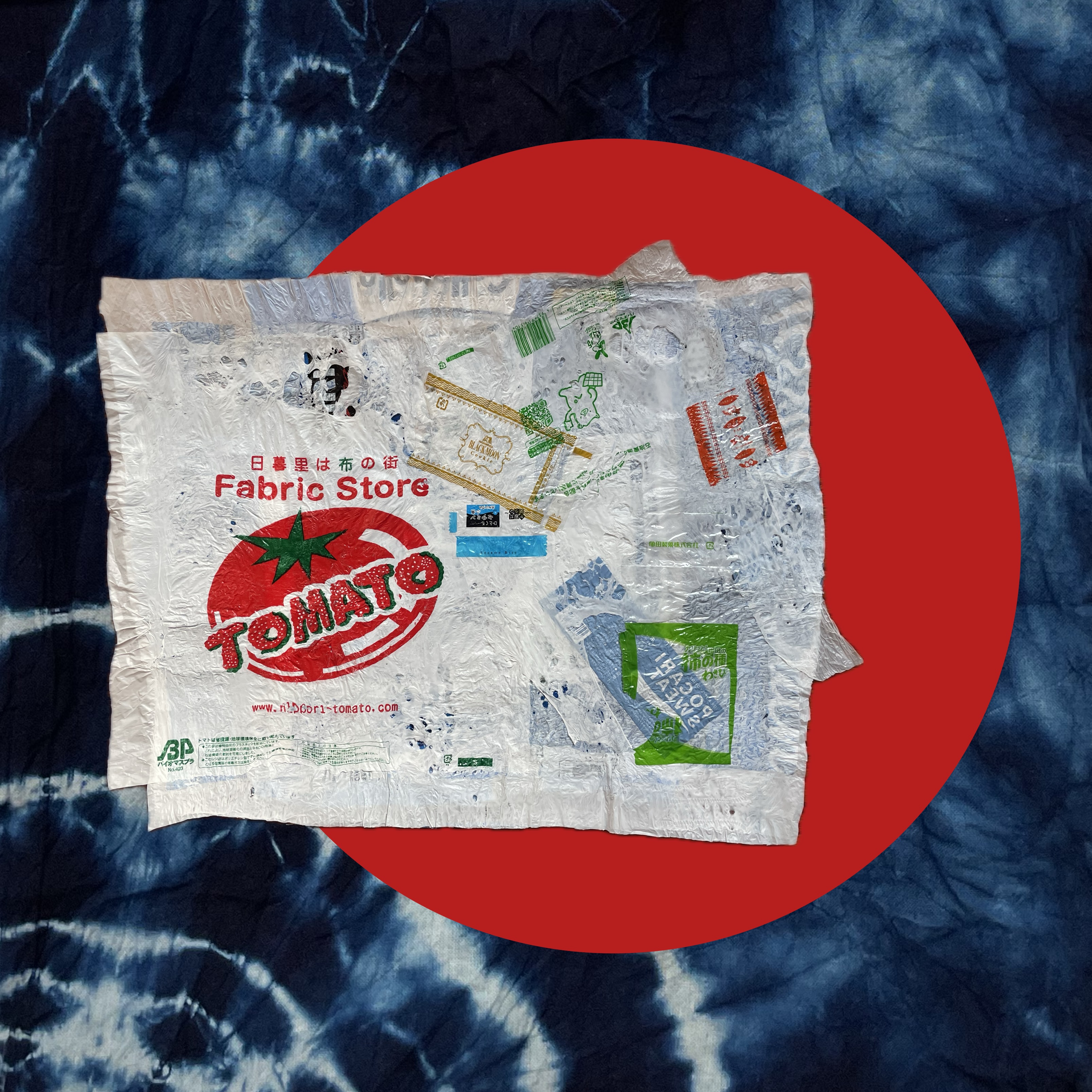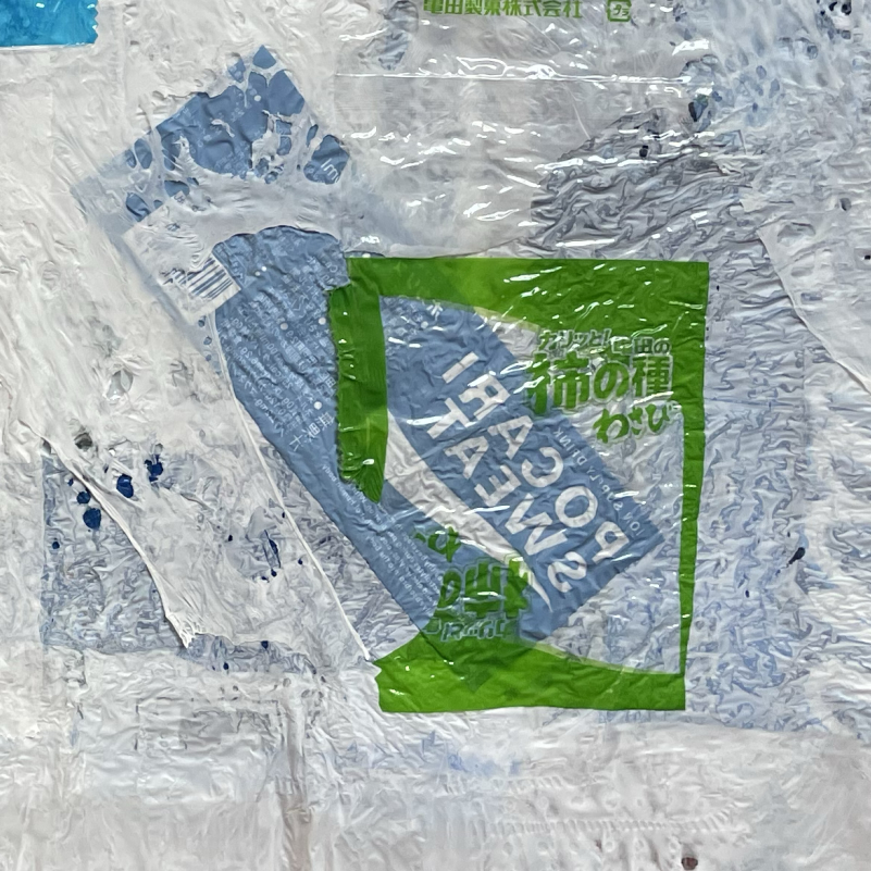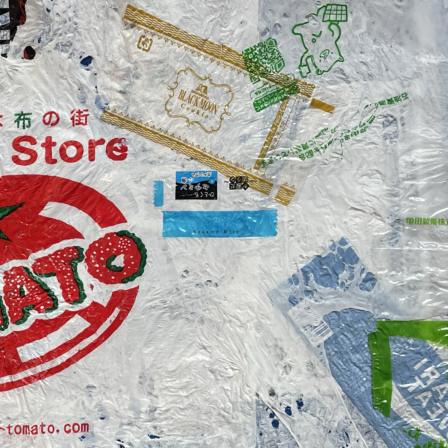 Plastic collage made from food packaging, wrappers, and shopping bags from Tokyo, Japan. Experimenting with different types of plastic melted at different temperatures resulted in manipulation of the original material via warping and "lace"-making.