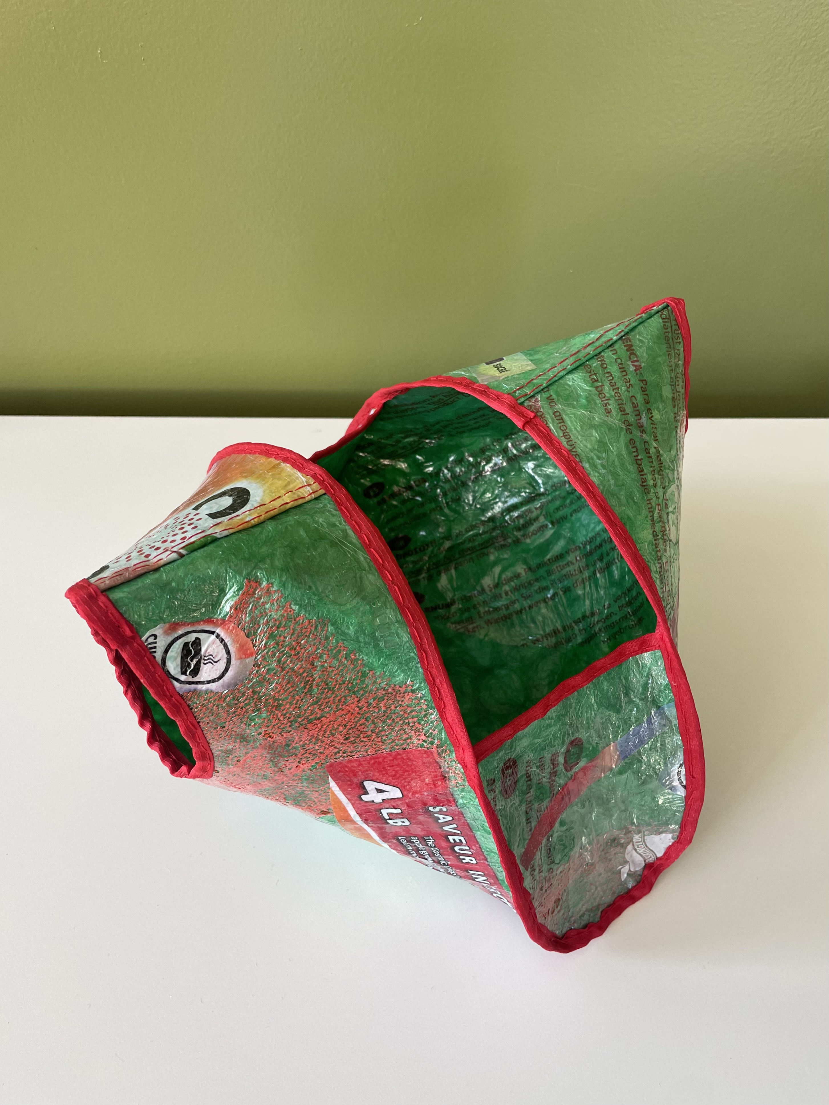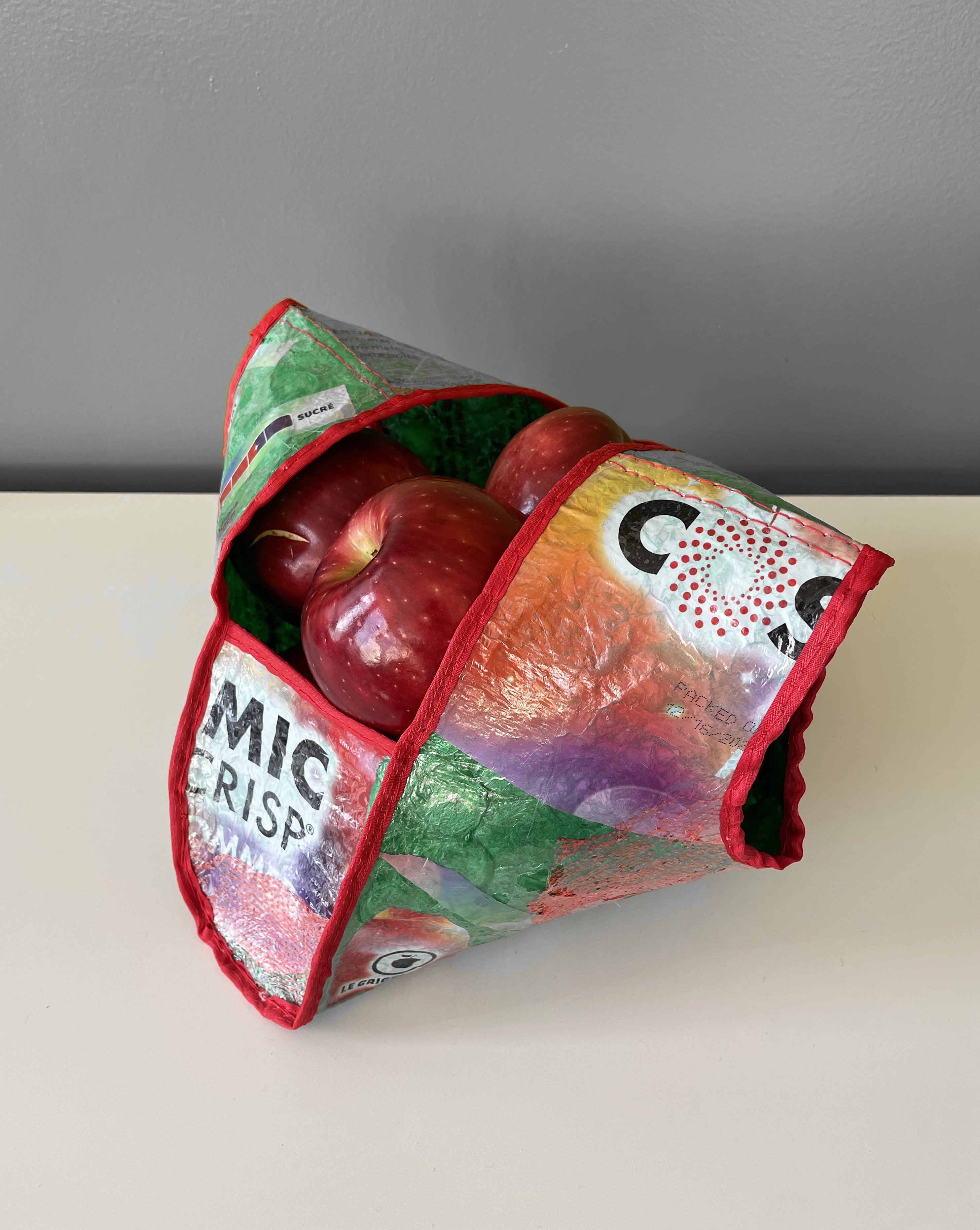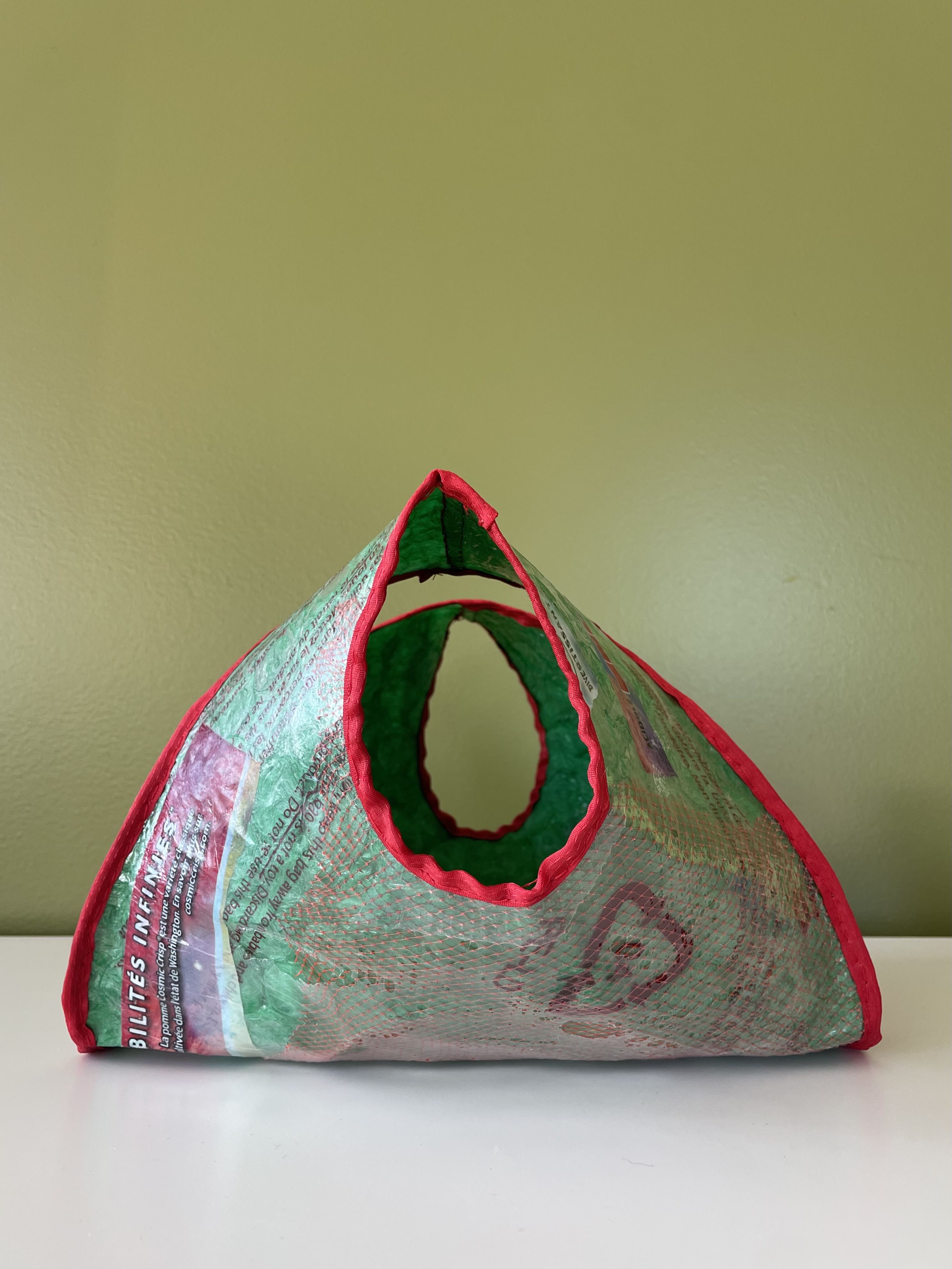 Functional fruit basket made by hand-processing over six layers of plastic waste (bubble wrap, shipping and food packaging) and then cutting and hand-sewing to use all material in the finished product.